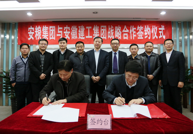 2015年12月3日,安糧集團與安徽建工集團戰(zhàn)略合作協(xié)議簽約儀式在盛安廣場22樓會議室舉行,安徽建工集團副總經(jīng)理許克順、安糧集團黨委副書記、安糧控股常務(wù)副總裁方宗友、安糧控股副總裁曹訓(xùn)立、安糧集團總經(jīng)理助理周洪出席儀式。