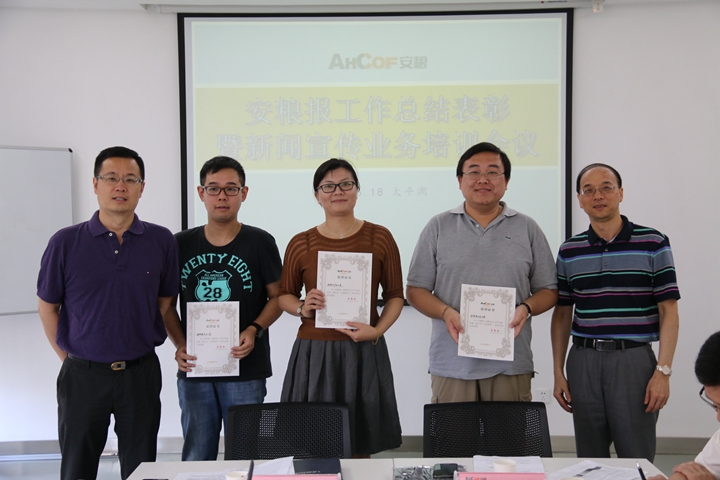 《安糧報(bào)》主編沈瑞勇首先匯報(bào)了《安糧報(bào)》創(chuàng)刊三年來(lái)的工作,執(zhí)行總編潘冬生宣讀了《關(guān)于表彰安糧報(bào)優(yōu)秀通訊員、優(yōu)秀編輯和先進(jìn)集體的決定》,安糧實(shí)業(yè)辦公室、安糧地產(chǎn)辦公室、安糧期貨辦公室三部門榮獲“先進(jìn)集體”稱號(hào);趙春進(jìn)、徐婷、陳凱、丁紹龍4人獲評(píng)“優(yōu)秀通訊員”;仲勁松、陶海燕2人獲評(píng)“優(yōu)秀編輯”。會(huì)議決定增補(bǔ)方嘉亮、李秀芳為《安糧報(bào)》編委會(huì)成員并明確了《安糧報(bào)》通訊員名單和通訊員工作職責(zé)。