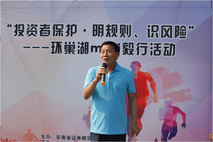 上午八點(diǎn)二十,濱湖新天地廣場上人頭攢動、旌旗招展,參加此次活動的全體員工在這里集合完畢?;顒娱_始前,安徽省證券期貨業(yè)協(xié)會副會長、秘書長鐘自木代表協(xié)會致辭。