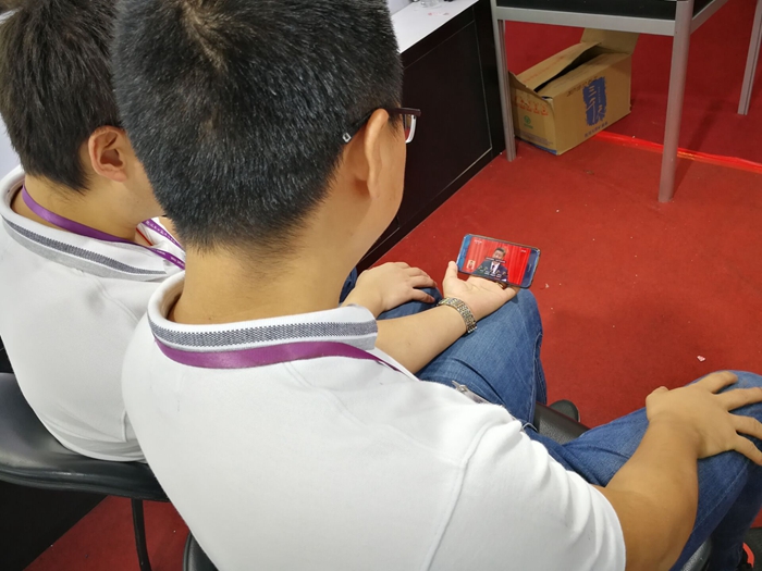 安糧國(guó)際員工在廣交會(huì)現(xiàn)場(chǎng)用手機(jī)觀看十九大開(kāi)幕式