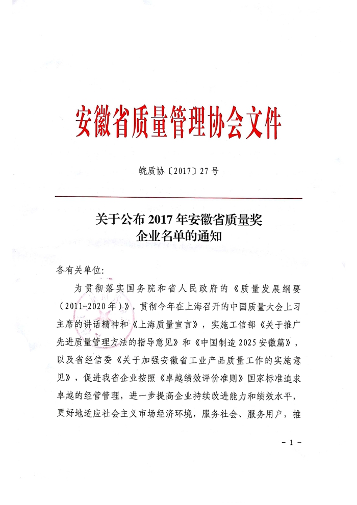 近日,“安徽省質(zhì)量獎”獲獎企業(yè)名單正式揭曉,安糧實業(yè)喜獲“2017年度安徽省質(zhì)量獎”。這是安糧實業(yè)繼榮獲"安徽名牌"、"安徽省守合同重信用企業(yè)"等榮譽后的又一省級榮譽,映射出安糧實業(yè)服務(wù)質(zhì)量、產(chǎn)品質(zhì)量的穩(wěn)定以及強大的企業(yè)綜合實力。