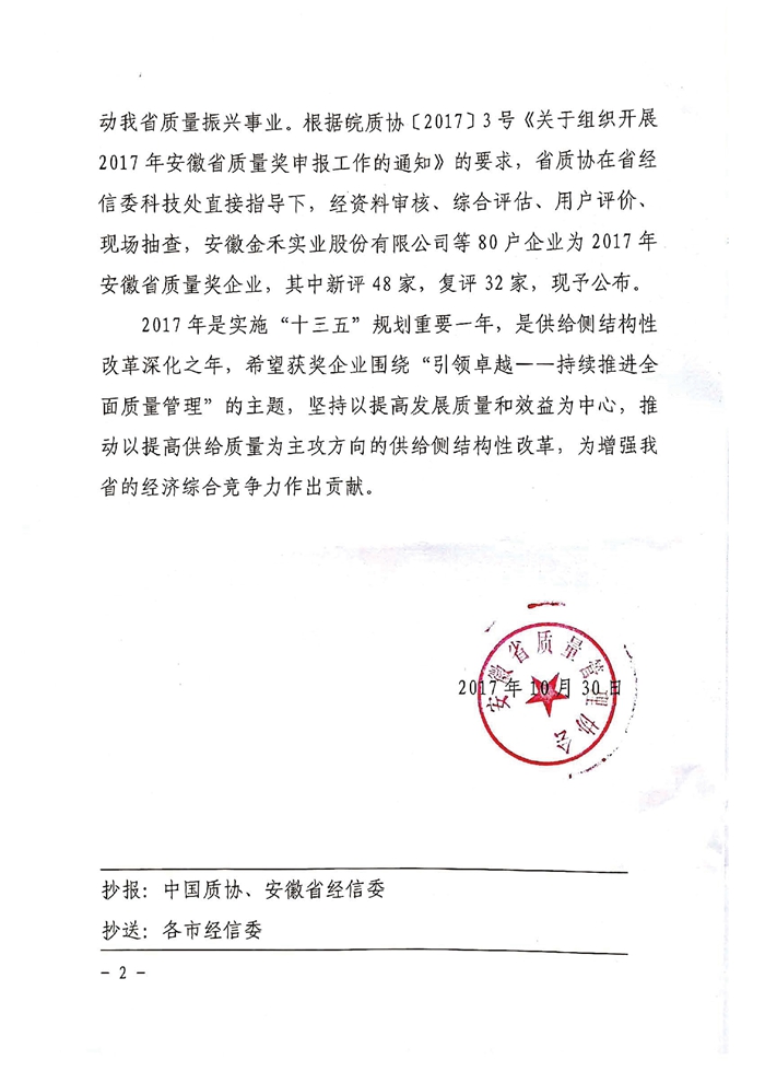 熱烈祝賀安糧實業(yè)榮獲“2017年度安徽省質(zhì)量獎”