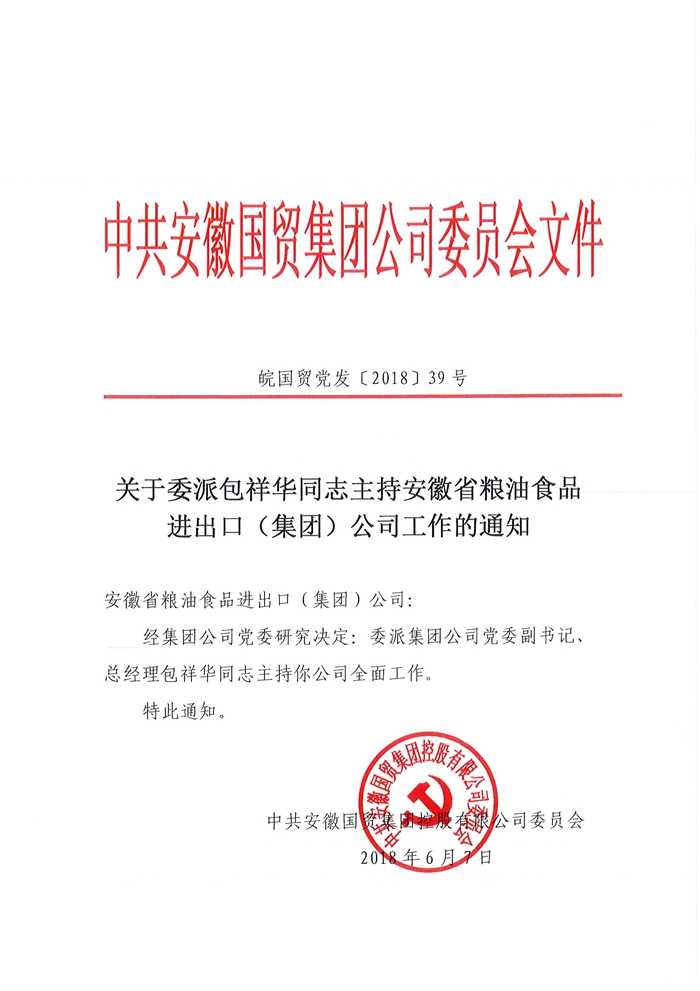 按照會議安排,首先由李明輝同志受國貿(mào)集團(tuán)黨委委托宣讀《關(guān)于委派包祥華同志主持安徽省糧油食品進(jìn)出口(集團(tuán))公司工作的通知》,包祥華同志、范陽同志先后講話。