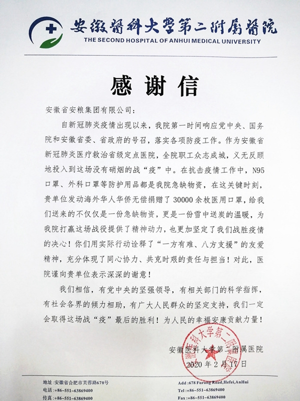 捐贈儀式上,安醫(yī)大二附院黨委副書記高長林親自將感謝信交到安糧實業(yè)黨支部書記、董事長吳國杰手中,正如安醫(yī)大二附院的感謝信中所寫“這不僅僅是一份急缺物資,更是一份雪中送炭的溫暖”,作為安徽省內(nèi)大型的專業(yè)進(jìn)出口貿(mào)易企業(yè),安糧實業(yè)為疫情防控做力所能及的事情是榮幸,更是一種責(zé)任,相信眾志成城,共克時艱,這場疫情阻擊戰(zhàn)就一定能夠打贏!
