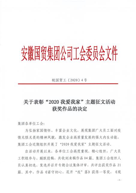 為弘揚(yáng)家國(guó)情懷、豐富企業(yè)文化,國(guó)貿(mào)集團(tuán)工會(huì)組織開(kāi)展了“2020我愛(ài)我家”主題征文活動(dòng)。安糧集團(tuán)工會(huì)積極參與,最終斬獲多項(xiàng)獎(jiǎng)項(xiàng),以最佳的姿態(tài)畫(huà)上圓滿的句號(hào)。