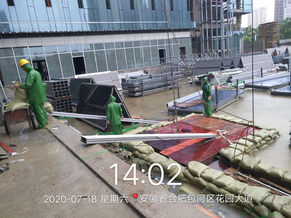 針對入梅以來嚴(yán)峻的防汛形勢,已交付及在運營項目積極協(xié)調(diào)物業(yè)公司,共同迎戰(zhàn)強(qiáng)降水天氣。位于合作化路和南二環(huán)交口的安糧國貿(mào)中心是此次防汛形勢較嚴(yán)峻的重點項目,特別是降雨量突破合肥市歷史極值的7月18至19日,積水內(nèi)澇直接影響到地下室的安全。險情出現(xiàn)時,一線人員及時匯報,各崗位人員在半個小時內(nèi)到崗參與排險工作。項目部對地庫出入口等易形成倒灌水的危險區(qū)域安排工作人員堆砌沙袋,打開集水井蓋板,保證積水最大流量的排放。同時配合唯品會工作人員啟動區(qū)域排水泵,對易積水難排水區(qū)域進(jìn)行再清理再疏通,隨著南二環(huán)和合作化路積水水位逐漸下降,安糧國貿(mào)中心順利通過了此次防汛考驗。