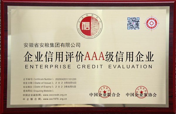 安糧集團(tuán)榮獲“企業(yè)信用評(píng)價(jià)AAA級(jí)信用企業(yè)”等級(jí)認(rèn)證