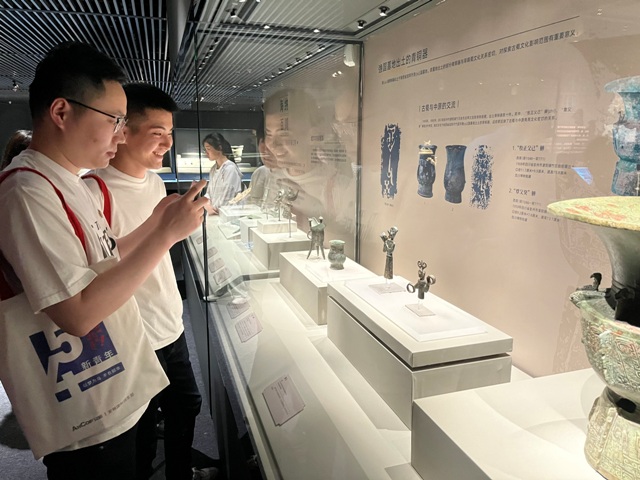 團員青年們首先集體參觀了“三星堆?長江流域青銅文明展”。作為二十世紀人類最偉大的考古發(fā)現(xiàn)之一,三星堆遺址被譽為“長江文明之源”。通過生動詳實的介紹,團員們深入了解了黃金面具、青銅人像等三星堆“頂流”文物,領(lǐng)略了長江流域青銅文明的歷史光輝和璀璨成就。