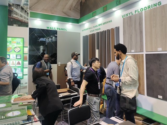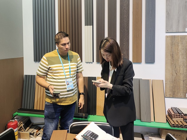 建材展位重點(diǎn)推出了墻板,格柵,樓梯踏板以及木塑戶外地板等新產(chǎn)品,從室內(nèi)到戶外產(chǎn)品一應(yīng)俱全。參展部門根據(jù)對(duì)去年秋季交易會(huì)的考察分析以及近期客戶最新詢盤情況的整合梳理,積極開(kāi)拓更新參展產(chǎn)品。結(jié)合國(guó)外最新流行的趨勢(shì),推出了拼花木紋,石紋等當(dāng)下十分暢銷的花色。利用立體燈箱,將產(chǎn)品優(yōu)勢(shì),產(chǎn)品結(jié)構(gòu)剖面等信息直觀展示,讓客戶更加清晰地了解產(chǎn)品的性能和優(yōu)點(diǎn),吸引諸多專業(yè)買家的觀看和洽談。此外,在攤位新增產(chǎn)品拼裝的體驗(yàn)區(qū),增加產(chǎn)品小樣及配件的DIY拼裝,吸引客戶自己動(dòng)手,大大提升了參與度和體驗(yàn)感,讓客戶真切地感受到安糧的誠(chéng)意與新意。