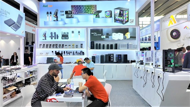 在電子消費(fèi)品類(lèi)展區(qū),安糧推出了不同款式的散熱機(jī)箱,再加上融入人體工程學(xué)設(shè)計(jì)的配套鍵鼠,能滿足不同PC DIY的需求。此外,大容量、多接口、充電快的移動(dòng)電源,也引得不少意向客戶紛紛下訂。